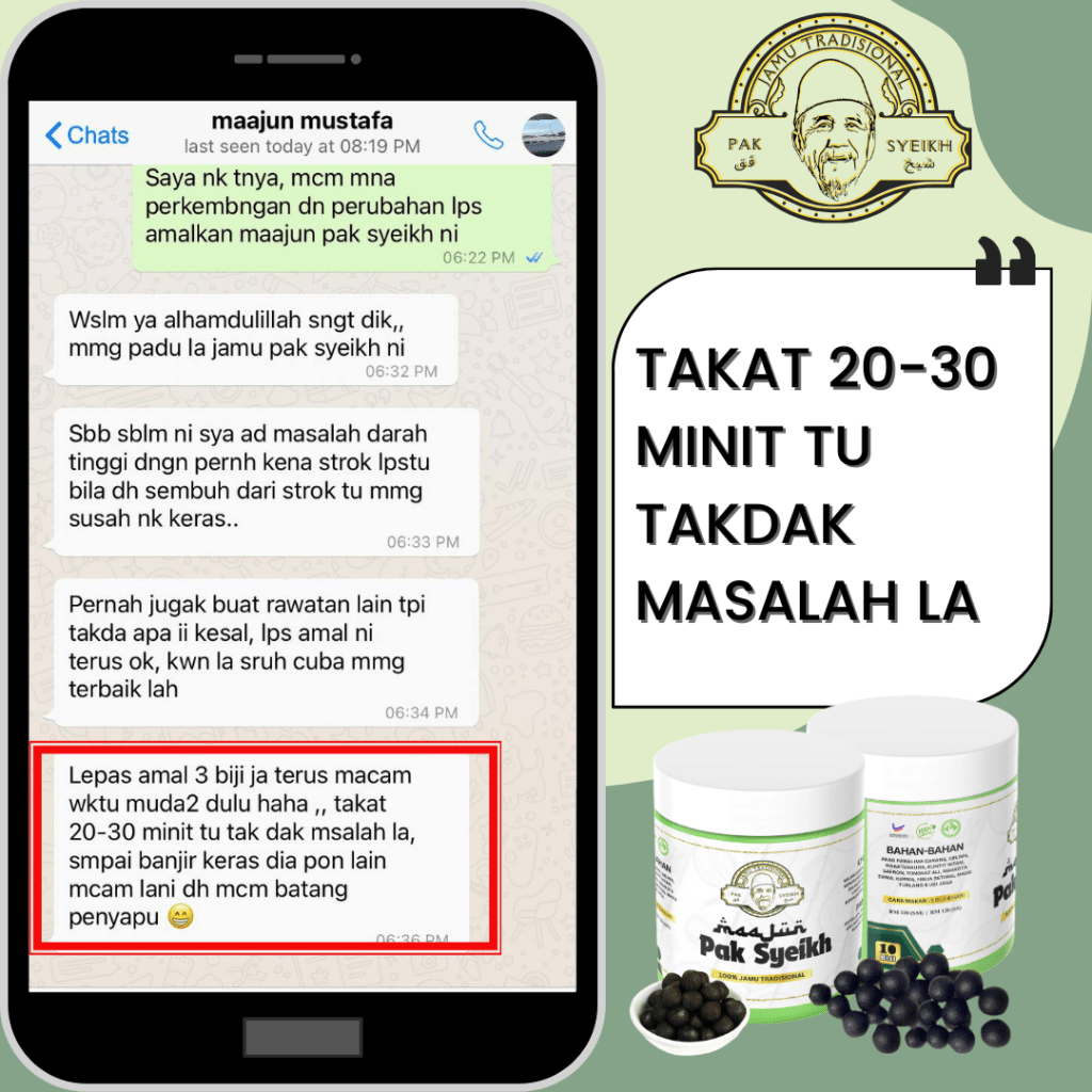 Alhamdulillah, tak perlu disangkalkan lagi kelebihan Maajun Pak syeikh ni.. mmg berkesan dn mnjadi utk org yg berumur sperti sya ni..